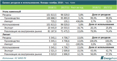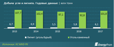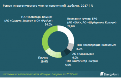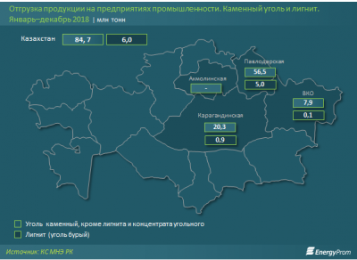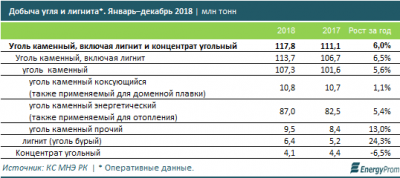От общего объема добычи угля и угольного концентрата на лигнит пришлось всего 5,5% (6,4 млн тонн), на каменный уголь — сразу 91,1% (107,3 млн тонн). При этом основную долю каменного угля — 81% — составил энергетический уголь (87 млн тонн), и лишь 10% — коксующийся (10,8 млн тонн). По оценкам АО «Самрук-Энерго», главный добытчик энергетического угля — «Богатырь Комир».