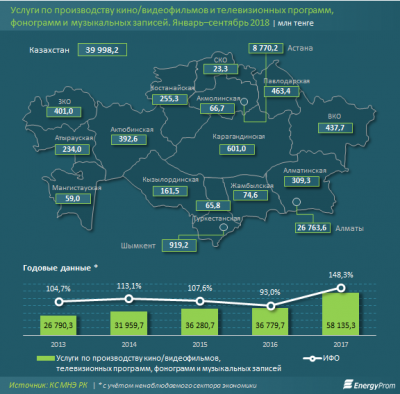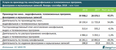 По итогам трех кварталов объем услуг по производству кино- и видеофильмов, телепрограмм, фонограмм и музыкальных записей составил почти 40 млрд тг — сразу на 42,5% больше, чем в аналогичном периоде прошлого года. Об этом сообщает сайт Energyprom.