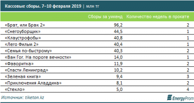 В прошлый уикенд, по данным портала ticketon.kz, абсолютным лидером по бокс-офису в РК оказался казахстанский фильм Алишера Утева «Брат, или Брак 2» — продолжение одной из самых кассовых казахстанских комедий 2017 года. Фильм в прокате вторую неделю и собрал с 7 по 10 февраля 96,2 млн тг.