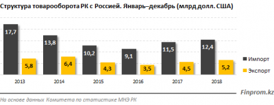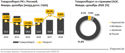 За 12 месяцев 2018 года товарооборот между Казахстаном и Россией составил 17,6 млрд долларов США — на 9,8% (1,6 млрд долларов США) больше, чем годом ранее. Совокупно за 2018 год товарооборот Казахстана достиг 93,5 млрд долларов США (годом ранее — 78,1 млрд долларов США). Доля России от общего объема внешнеторгового оборота страны составила 18,8%. Такие данные приводит finprom.kz.