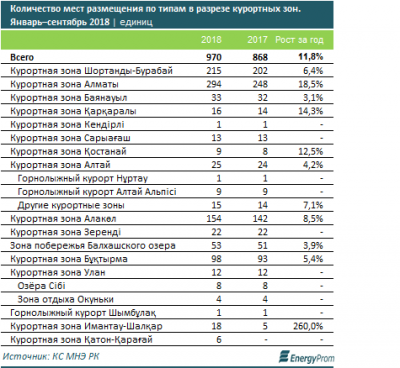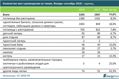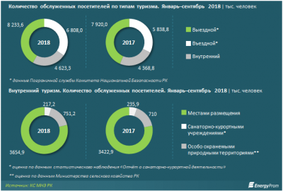 Туризм в РК развивается по всем трем направлениям: по итогам трех кварталов 2018-го выездной туризм вырос на 4% год-к-году (до 8,2 млн туристов), въездной — на 16,6% (до 6,8 млн человек), внутренний — на 5,8% (до 4,6 млн туристов). 78,3% внутренних туристов (3,4 млн) воспользовались услугами мест размещения — гостиницами, мотелями, домами отдыха и прочими туристскими базами. Еще 16,3% (710 тыс. туристов) посетили природные заповедники и прочие особо охраняемые природные территории. Около 5% (235,9 тысячи туристов) выбрали для отдыха санаторно-курортные учреждения. Такие данные приводит energyprom.kz.