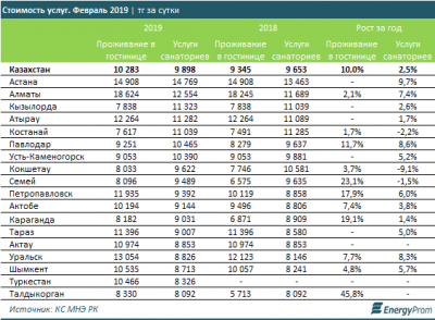 Услуги санаториев стоили в среднем 9,9 тыс. тенге за сутки, +2,5% к февралю 2018-го. Наибольшие цены отмечены в Астане (14,7 тыс. тг за сутки, +9,7% за год), Алматы (12,6 тыс. тг за сутки, +7,4% год-к-году) и Кызылорде (11,3 тг за сутки, +2,6%).