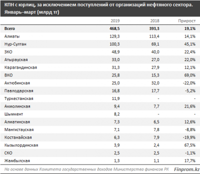 За январь-март 2019 года сумма корпоративных подоходных налогов с юрлиц* по Казахстану составила 468,5 млрд тенге, увеличившись сразу на 19,1%. Для сравнения: в аналогичном периоде 2018-го сумма КПН достигала 393,3 млрд тенге.