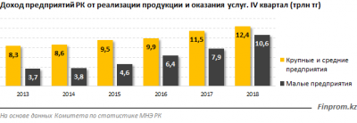 Для малых предприятий показатель составил 10,6 трлн тенге. Годовой рост достиг сразу 35,4%: в 2017-м доходы в соответствующем периоде составляли всего 7,9 трлн тенге.