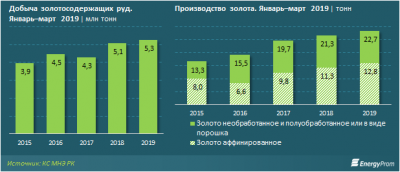 Увеличивается и производство золота. Так, за первый квартал 2019 года было произведено 22,7 тонны необработанного золота (+12,6% за год) и 12,8 тонны аффинированного золота (+6,6% за год).