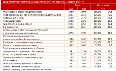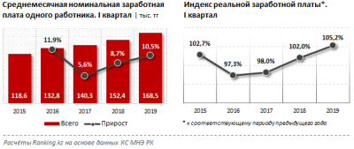 В I квартале 2019 года среднемесячная зарплата одного работника составила 168,5 тыс. тенге, при годовом росте сразу на 10,5%. При этом реальный рост покупательской способности заработных плат казахстанцев с учётом инфляции достиг 5,2% — это рекордный показатель за последние годы. Такие данные приводит ranking.kz.