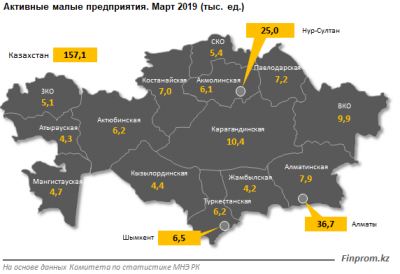 В региональном разрезе наибольшее количество малых активных компаний наблюдается в Алматы и Нур-Султане: 36,7 тысячи и 25 тысяч соответственно. В совокупности их число увеличилось на 23,7% за год.