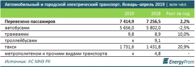 За январь-апрель текущего года перевозки пассажиров автомобильным и городским электрическим транспортом составили 7,4 млрд человек — на 2,2% больше, чем в аналогичном периоде годом ранее. Лидером по пассажирским перевозкам ожидаемо является Алматы: 1,7 млрд человек (+3,7% за год). На втором месте Нур-Султан (+0,1% за год, до 801,2 млн человек), на третьем — Костанайская область (+1,4% за год, 592 млн человек). Такие данные приводит energyprom.kz.