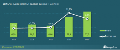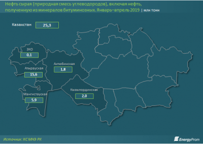 Добыча сырой нефти за 4 месяца 2019 года в натуральном выражении составила 25,3 млн тонн — на 0,2% меньше, чем в 2018-м. Почти 62% добычи пришлось на Атыраускую область (15,6 млн тонн, +1% за год). Заметим, это единственный регион из тройки ключевых, закончивший период в плюсе. Так, компании обеспечившей еще 23,2% добычи Мангистауской области ушли в минус на 1,1%, до 5,9 млн тонн, Кызылординской — на 7,9%, до 2 млн тонн (7,7% от РК). Такие данные приводит energyprom.kz.