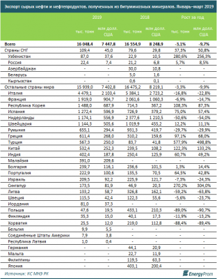 Пока на фоне сокращения добычи экспорт сырой нефти также уменьшился год-к-году: на 3,1% в натуральном выражении (16 млн тонн) и на 9,7% — в деньгах (7,4 млрд долларов). Основной импортер казахстанской нефти — Италия (4,5 млн тонн за январь-март 2019-го, на 16,8% меньше, чем в аналогичном периоде годом ранее). В деньгах поставки составили 2,1 млрд долларов — сразу на 22,8% меньше, чем годом ранее.