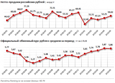обменный курс рубля в среднем за май 2019 года составил 5,86 тенге за 1