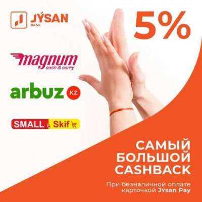 Решение. При безналичной оплате картой Jysan Pay начисляется высокий Cashback в размере 5% в следующих магазинах: