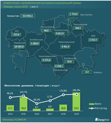 По итогам первого полугодия текущего года инвестиции, направленные на охрану окружающей среды, достигли 53,5 млрд тенге, увеличившись более чем в 2,8 раза по сравнению с аналогичным периодом прошлого года (18,8 млрд тенге).