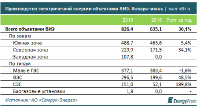По итогам первого полугодия возобновляемыми источниками энергии было произведено 826,4 млн кВт в час электроэнергии — на 30,1% больше, чем в аналогичном периоде годом ранее (635,1 млн кВт в час). Больше всего электроэнергии было произведено малыми ГЭС: 377,1 млн кВт в час (годом ранее — 383,4 млн кВт в час). Ветровые электростанции увеличили производство на 48,5%, до 296,5 млн кВт в час (годом ранее — 199,6 млн кВт в час). Объем производства электроэнергии солнечными электростанциями увеличился в 2,9 раза за год и составил 151 млн кВт в час (годом ранее — 52,1 млн кВт в час). Биогазовыми установками было произведено 1,8 млн кВт в час электроэнергии.