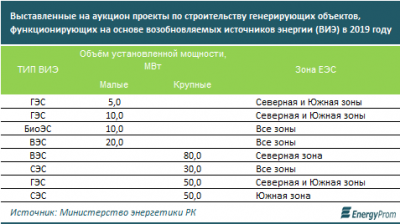Суммарный объем установленной мощности, запланированный к отбору в 2019 году, составляет 255 МВт. Из них солнечные электростанции — 80 МВт, ветровые электростанции — 100 МВт, гидроэлектростанции — 65 МВт, биоэлектростанции — 10 МВт.