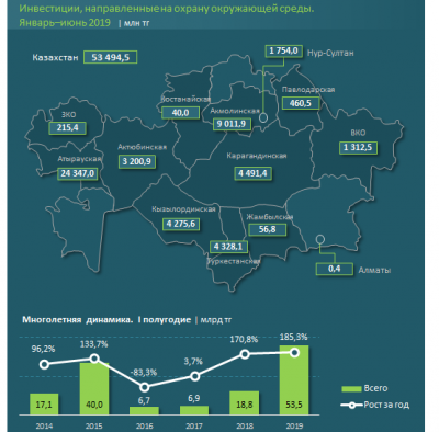 По итогам первого полугодия текущего года инвестиции, направленные на охрану окружающей среды, достигли 53,5 млрд тенге, увеличившись более чем в 2,8 раза по сравнению с аналогичным периодом прошлого года (18,8 млрд тенге).