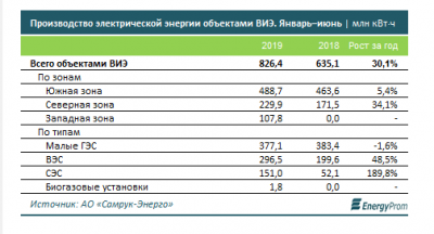 По итогам первого полугодия возобновляемыми источниками энергии было произведено 826,4 млн кВт·ч электроэнергии — на 30,1% больше, чем в аналогичном периоде годом ранее (635,1 млн кВт·ч). Больше всего электроэнергии было произведено малыми ГЭС: 377,1 млн кВт·ч (годом ранее — 383,4 млн кВт·ч). Ветровые электростанции увеличили производство на 48,5%, до 296,5 млн кВт·ч (годом ранее — 199,6 млн кВт·ч). Объем производства электроэнергии солнечными электростанциями увеличился в 2,9 раза за год и составил 151 млн кВт·ч (годом ранее — 52,1 млн кВт·ч). Биогазовыми установками было произведено 1,8 млн кВт·ч электроэнергии.