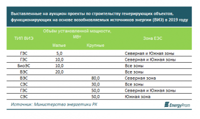 Суммарный объем установленной мощности, запланированный к отбору в 2019 году, составляет 255 МВт. Из них солнечные электростанции — 80 МВт, ветровые электростанции — 100 МВт, гидроэлектростанции — 65 МВт, биоэлектростанции — 10 МВт.