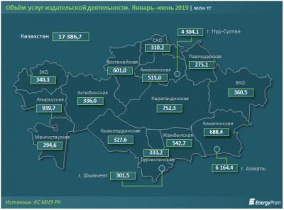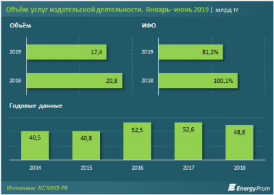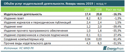 Объем услуг издательской деятельности за первое полугодие 2019 года составил 17,4 млрд тенге — на 16,3% меньше, чем за аналогичный период прошлого года. Индекс физического объема к январю-июню 2018 года составил 81,2%.