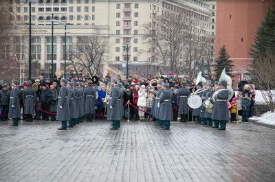 8 марта в Александровском саду под аккомпанемент Кремлевского оркестра военнослужащие устроили праздничное представление для девушек - продемонстрировали элементы строевой подготовки и подарили прекрасной половине человечества букеты цветов.