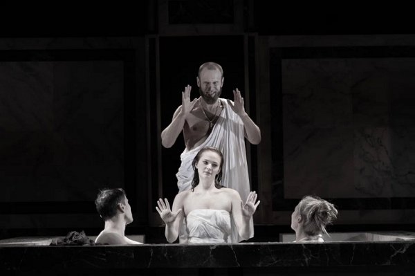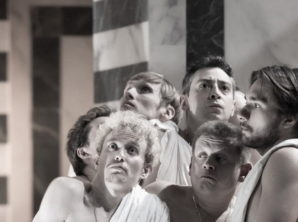 Итак, городничий (Дмитрий Липинский), грозный как римский император, сообщает пренеприятное известие застывшим в бассейне-купели коллегам-сообщникам-подельникам. И сразу становится понятно, как идеально на созданное Александром Боровским и Дамиром Исмагиловым банное пространство ложится классическое произведение, какое количество гэгов, новых забавных оттенков и эстетически безупречных отсылок к шедеврам живописи-архитектуры-кино позволяет оно создать — от «Пьеты» Микеланджело до фильмов Феллини и Пазолини. Классический текст, классическое единство времени, места и действия в сочетании с музыкой Верди и Россини, в сочетании с молодыми, как всегда резвящимися по-полной, актерами «СТИ» создает опять же классический контрапункт.