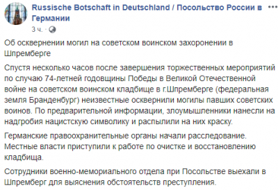 Дипломаты написали в Facebook, что инцидент произошел на кладбище в Шпремберге спустя несколько часов после того, как там состоялись торжественные мероприятия по случаю 74-летней годовщины победы СССР в войне.