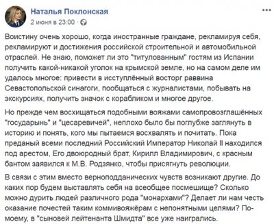 - Да, это передёргивание. Так, как Николай II являлся еще императором. Родственник ему изменил, можно сказать и так. Но даже монархисты не едины в оценках моральных аспектов. Факты, изложенные в посте Натальи Поклонской, мягко говоря, не являются стопроцентно точными.