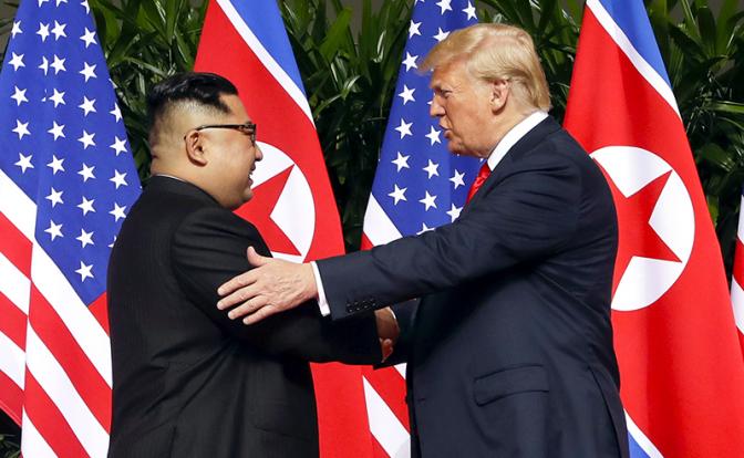 12 июня 2018 года в Сингапуре, на острове Сентоза, в 1 час 4 минуты по Гринвичу обменялись улыбками и пожали руки лидеры двух стран, находящихся на противоположных идеологических полюсах — США и КНДР. Вначале Трамп и Ким Чен Ын говорили один на один, рядом были только переводчики. Позже присоединились высокопоставленные помощники. Со стороны США — советник по национальной безопасности Джон Болтон, госсекретарь Майк Помпео и глава администрации Белого дома Джон Келли.
