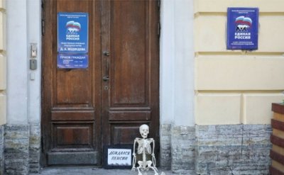 Сегодня утром в Петербурге прошла новая акция против повышения пенсионного возраста. Активисты движения «Время» оставили подарок для петербургского отделения партии «Единая Россия» — у дверей штаба политического объединения появился сидячий человеческий скелет с табличкой «Дождался пенсии» и значком «Я люблю Медведева».