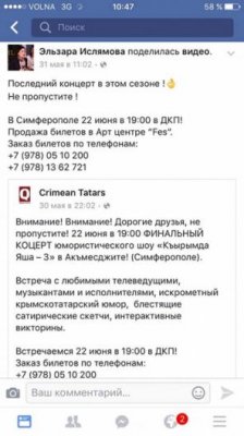 22 июня в Симферополе прошел финальный концерт юмористического шоу «Къырымда Яша-3» — «искрометный крымско-татарский юмор и блестящие сатирические скетчи». Анонсировала концерт организатор шоу Эльзара Ислямова — родная сестра и ближайшая сподвижница лидера «блокады» Крыма Ленура Ислямова.