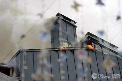 © Новости Дня / Илья ПиталевПожарные расчеты МЧС РФ тушат возгорание на крыше Дома педагогической книги в Москве