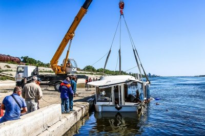 © Фото : ГУ МЧС РФ по Волгоградской областиПоднятие катамарана, потерпевшего крушение в Волгограде, на сушу. 12 июня 2018
