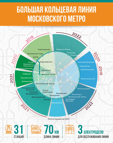На данный момент Большая кольцевая линия метро готова на 54%. Ее появление сделает метро ещё удобнее, соединив основные пересадочные пункты московских диаметров, МЦК и железнодорожные узлы: 19 пересадок на другие линии метро; 4 пересадки на МЦК; 6 пересадок на Московские центральные диаметры (МЦД) и 11 пересадок на линии железной дороги.