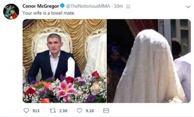 Ранее российский боец назвал ирландца "ревнивой женой", которая уходит, но каждый раз возвращается. В ответ Макгрегор опубликовал фото со свадьбы Нурмагомедова и написал: "Твоя жена - полотенце".