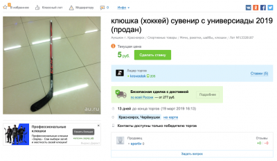 5 марта на сайте au.ru неизвестный россиянин объявил о продаже за ненадобностью сувенира с Универсиады - хоккейной клюшки со стартовой ценой в 5 рублей. Во время торгов цена достигала 50 000 рублей, но сколько за снаряд заплатил новый владелец осталось загадкой. По словам продавца, клюшка станет достоянием частной коллекции.