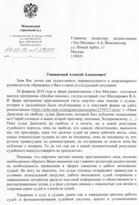 "Считаю совершенно недопустимыми отзывы о судьях и их работе, подобные тем, что прозвучали в упомянутом эфире "Эха Москвы". Прошу вас, Алексей Алексеевич, внимательнее и деликатнее относиться к содержанию эфиров в части оценки работы судейского корпуса столицы. Обращаюсь к вам, поскольку уверена в том, что, если вы возьмете ситуацию под свой личный контроль, подобное впредь не повторится", — подытожила Егорова.