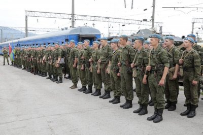 Российские десантники в честь прибытия своих коллег провели на железнодорожной станции «Тоннельная» торжественное мероприятие, а затем все вместе в составе колонны проследовали на полигон «Раевский».