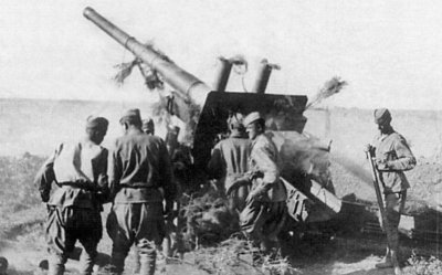 Поэтому, на начальном этапе войны стрельба производилась на прямой или полупрямой наводке. Что, естественно, приводило к огромным потерям среди артиллеристов.