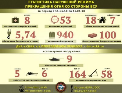 По словам Якубова, всего украинские силовики за неделю 53 раза нарушили режим прекращения огня. В результате обстрелов ранено восемь мирных жителей, повреждено 18 жилых домов и семь объектов инфраструктуры.