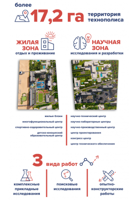 Научный сектор технополиса будет состоять из исследовательского и производственного корпусов, лабораторного комплекса, центра обработки данных, нескольких отделений для разработок узкоспециализированных концепций, в том числе и открытых площадок для испытаний, оснащенных современным оборудованием.
