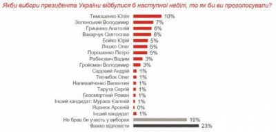 Пальму первенства с пресловутыми 10% удерживает Юлия Тимошенко, опережая всего на три позиции скандального скомороха Владимира Зеленского, за которого готовы проголосовать 7%. Третье место делят между собой Святослав Вакарчук и экс-министр обороны Анатолий Гриценко, за них готовы впрячься в бюллютень по 6% избирателей.