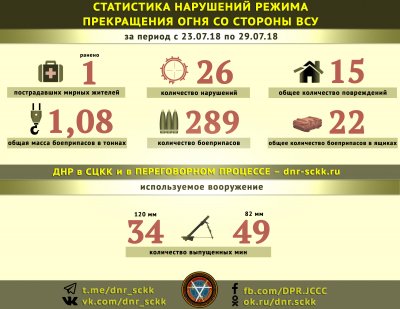 Армия Украины за неделю с 23 по29 июля выпустила по прифронтовым районам Донецкой Народной Республики свыше одной тонны боеприпасов. Об этом сегодня заявил руководитель представительства ДНР в СЦКК Руслан Якубов.