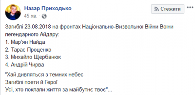 Как сообщает волонтер Назар Приходько на своей странице в Facebook, четверо погибших служили в батальоне «Айдар». Их имена: Марьян Найда, Тарас Проценко, Михаил Щербанюк, Андрей Чирва.