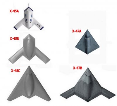 Аналогично можно сказать и про демонстраторы БПЛА Х-45 фирмы Boeing. Здесь было аж целых три варианта, различающихся как размером, так и формой. Видимо, Boeing больше денег нашёл на эту программу.