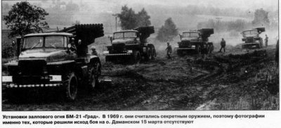 Она установка «Град» способна за 20 секунд выпустить 40 реактивных снарядов калибра 122 мм и поразить цели на площади в 15-20 гектаров на удалении до 25-30 километров. По скоплениям китайских войск на и возле острова Даманский стреляли несколько «Градов». Применение секретной на тот момент техники было санкционировано на самом верху: нужно было ошеломить Китай военной мощью СССР и не дать разгореться полномасштабной войне. Задача была выполнена. По воспоминаниям очевидцев событий, в районе, который накрыло «Градами» ещё неделю плавилась земля.
