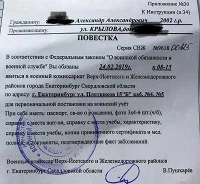"В соответствии с Федеральным законом "О воинской обязанности и военной службе" вы обязаны 24.02.2019 к 08:15 явиться в военный комиссариат Верх-Исетского и Железнодорожного районов города Екатеринбурга […] для первоначальной постановки на воинский учет", - говорится в письме.