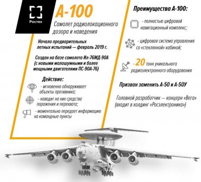 В феврале к предварительным летным испытаниям приступил российский самолет радиолокационного дозора и наведения А-100, головным разработчиком которого является Концерн «Вега» (входит в холдинг «Росэлектроника»). «Летающий радар» нового поколения должен прийти на смену комплексам А-50 и А-50У, при этом значительно превзойти их возможности, сообщает Ростех.