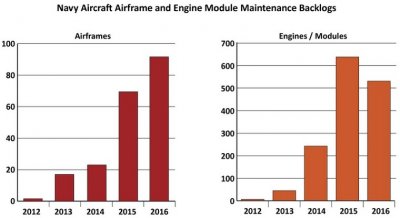 Высокая оперативная нагрузка, задержка с поступлением F-35C, и внимание! — финансовые трудности!!! привели к тому, что обеспечиваются лишь текущие потребности региональных командований. Срок развёртывания дополнительного авиакрыла палубной авиации для решения непредвиденных дополнительных задач вырос за последние годы с 3 месяцев до 6-12.