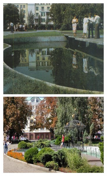 Непривычно видеть его возвышающимся над окружающими деревьями. Голубые ели, по всей видимости, были посажены совсем недавно. На заднем фоне видна огромная надпись на крыше дома: «Дитячий одяг ЮН?СТЬ». Фото начала 1970-х и наших дней.