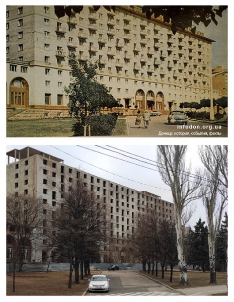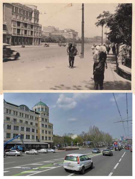 11. Улица Артема около здания гостиницы Донбасс в 1942-43 годах и сегодня. Здание, построенное в 1938 году просуществовало до 26 февраля 2001 года. В рамках «реконструкции» гостиницы старое здание гостиницы было взорвано, а на его месте возведено новое.